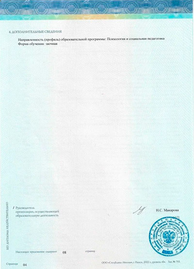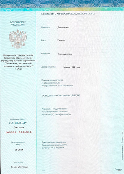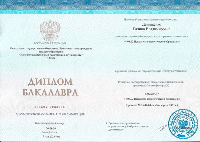 2023 г. – ФГБОУ ВО "Омский государственный педагогический университет" (Психология и социальная педагогика ).