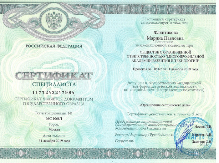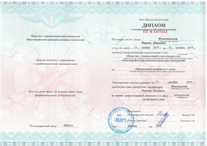 2019 г. – ООО “Многопрофильная академия развития и технологий  (Сестринское дело);