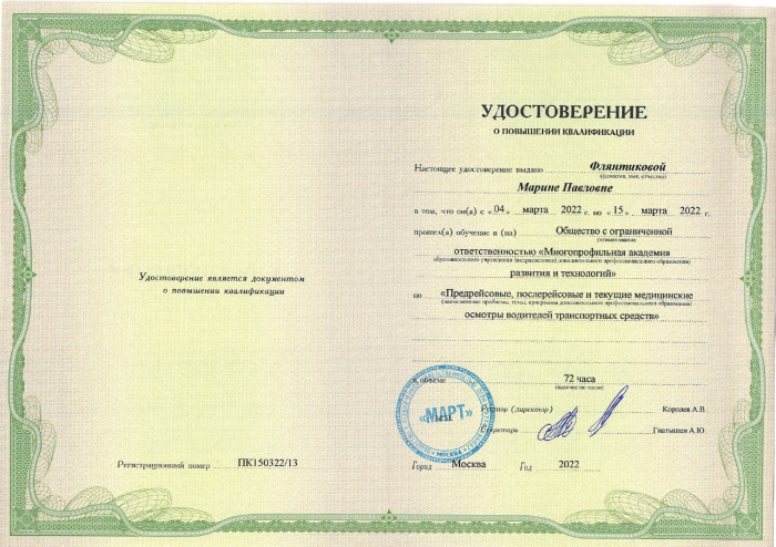 2022 г. – ООО “Многопрофильная академия развития и технологий  (Предрейсовые, послерейсовые и текущие медицинские осмотры водителей транспортных средств).
