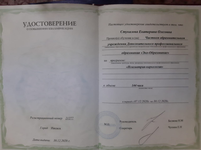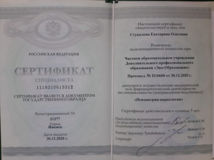 Психиатр-нарколог Екатерина Олеговна Стукалова специализируется на лечении игровой, никотиновой, алкогольной, компьютерной (интернет), наркотической зависимости с применением различных методик. Также проводит диагностику и лечение апатии, депрессии, неконтролируемой агрессии, булимии, анорексии, панических расстройств, страхов и фобий и других психических расстройств.